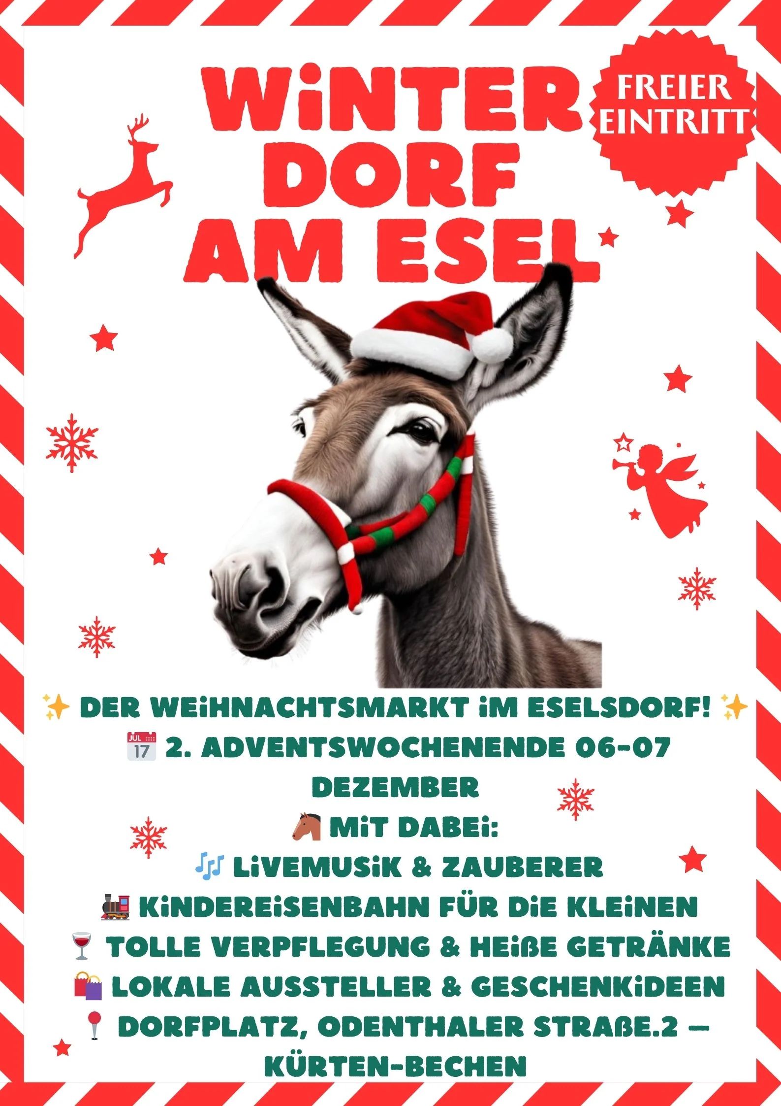 Tauchen Sie ein in eine zauberhafte Winterwelt! Zum zweiten Mal lädt das Winterdorf am Esel auf den festlich geschmückten Dorfplatz in Kürten-Bechen ein. Auf dem Markt gibt es Livemusik: stimmungsvolle Acts für echte Weihnachtsatmosphäre wie Die Flöckchen & Stadtjeföhl, den Zauberer Micky: magische Shows für Groß & Klein, die Kindereisenbahn „Tommy“: Highlight der Kinder. Als Verpflegung gibt es Glühwein, Punsch, Herzhaftes & Süßes und lokale Aussteller bieten Handgemachtes, Feinkost & Geschenkideen an.